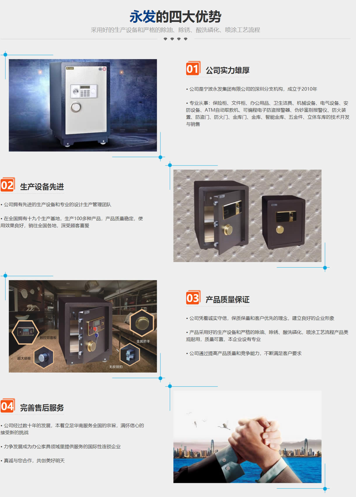深圳永發(fā)安防產(chǎn)品有限公司 深圳永發(fā)安防產(chǎn)品有限公司,是寧波永發(fā)集團(tuán)有限公司的深圳分支機(jī)構(gòu),成立于2010年,專業(yè)從事:保險(xiǎn)柜、文件柜、辦公用品、衛(wèi)生潔具、機(jī)械設(shè)備、電氣設(shè)備、安防設(shè)備、ATM自動(dòng)取款機(jī)、可編程電子防盜報(bào)警器、偽鈔鑒別報(bào)警儀、防火裝置、防盜門、防火門、金庫門、金庫、智能金庫、五金件、立體車庫的技術(shù)開發(fā)與銷售。
